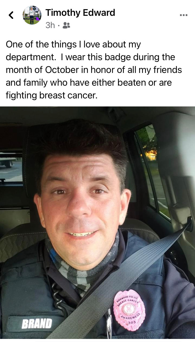But anyway, Tim and I were sitting in the waiting room at the Dr Hulsen’s office and I was scrolling through my FB feed and I saw this post from a dear friend Tim, who is a LEO with Kirkwood. I met Tim through MY Tim when they played on the same team in a “beer league “ softball team in Kirkwood. Even though they don’t play anymore, Tim and I have kept in touch via FB. He helped me after my shoulder surgery 5 years ago and we chat periodically about our soccer playing boys. Well, this was his post today and I responded to him saying thank you for his support and that it truly brought a smile to my face when I saw it. 😁 I’ve always seen Firefighters wear pink shirts in October but a LEO with a pink badge, that is beyond cool! Kudos to the the Kirkwood Police Department - thanks for supporting all of us pink sisters! 💕